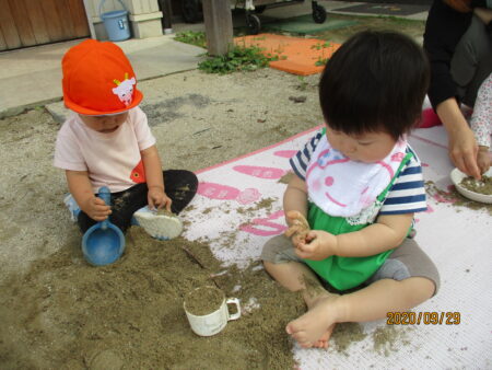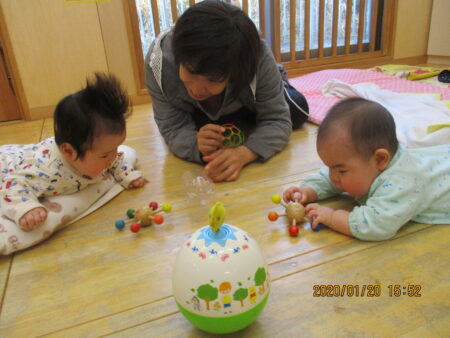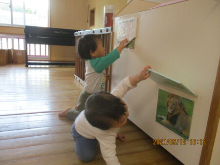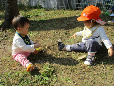 また、2020年度より、1・2歳児混合でクラス編成をしています。大きい子は小さい子の面倒を見ることで「自信」と「思いやり」を育み、また小さい子は大きい子に「憧れ」や「親しみ」を抱きます。こうした交流を通して、社会性やコミュニケーション能力、対人関係能力を身に着けていきたいと思っています。月齢によって「できる」か「できない」かで子どもを見るのではなく、一人ひとりの発達をじっくり待てるのも、異年齢保育の良さだと考えています。