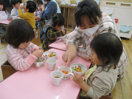 - 味付けは薄味にしています。食品本来の味を知らせていくために、味付けは薄味にして食品そのものの味が活きるように調理しています。