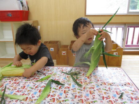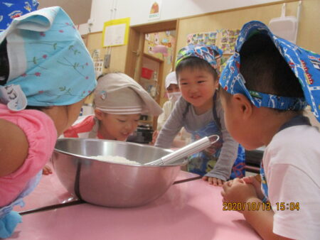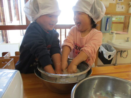 野菜かごを展示し、子どもたちがその日の給食に使う食材を見たり触れたりできるようにしています。また、1,2歳児クラスでは、米とぎ当番やきのこさきなど、普段の給食づくりを体験したり、ホットケーキやおにぎりなどのクッキングも2歳児を中心に行っています。