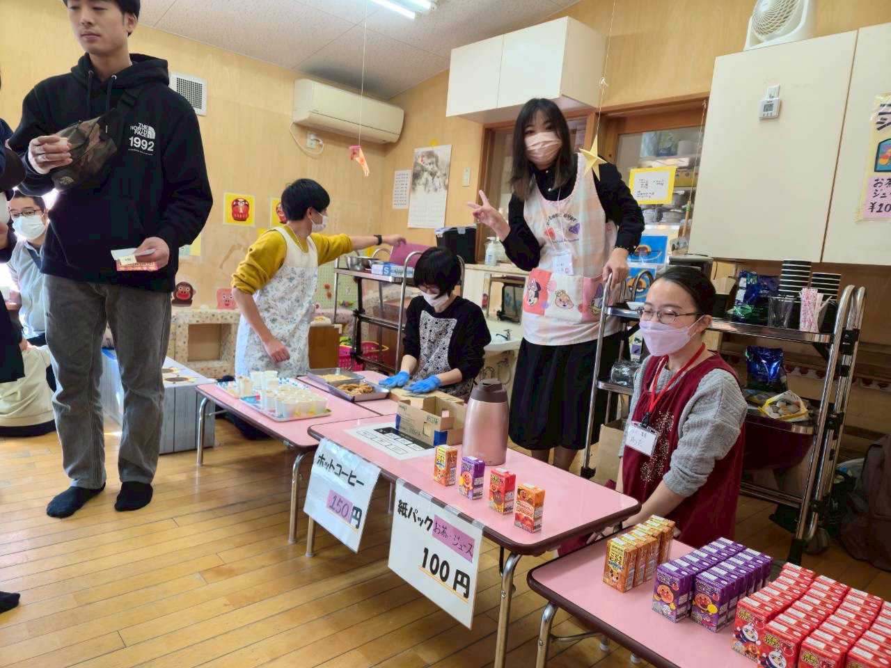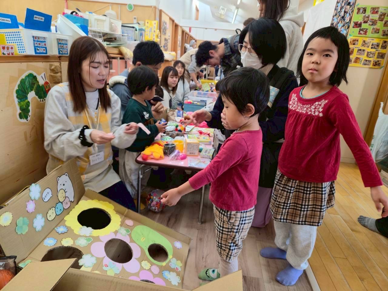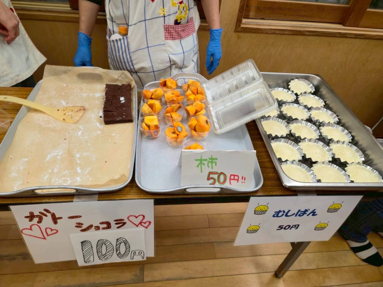 例年どおり楽しいゲームコーナーや給食室からの蒸しパンやじゃがバター(豆乳マーガリン)に加え、どんぐりグループのパパが作ってくれたガトーショコラがあり大人気でした。また今年はポップコーンにかわり、たけのこグループのママ考案のきな粉棒も飛ぶように売れました♡